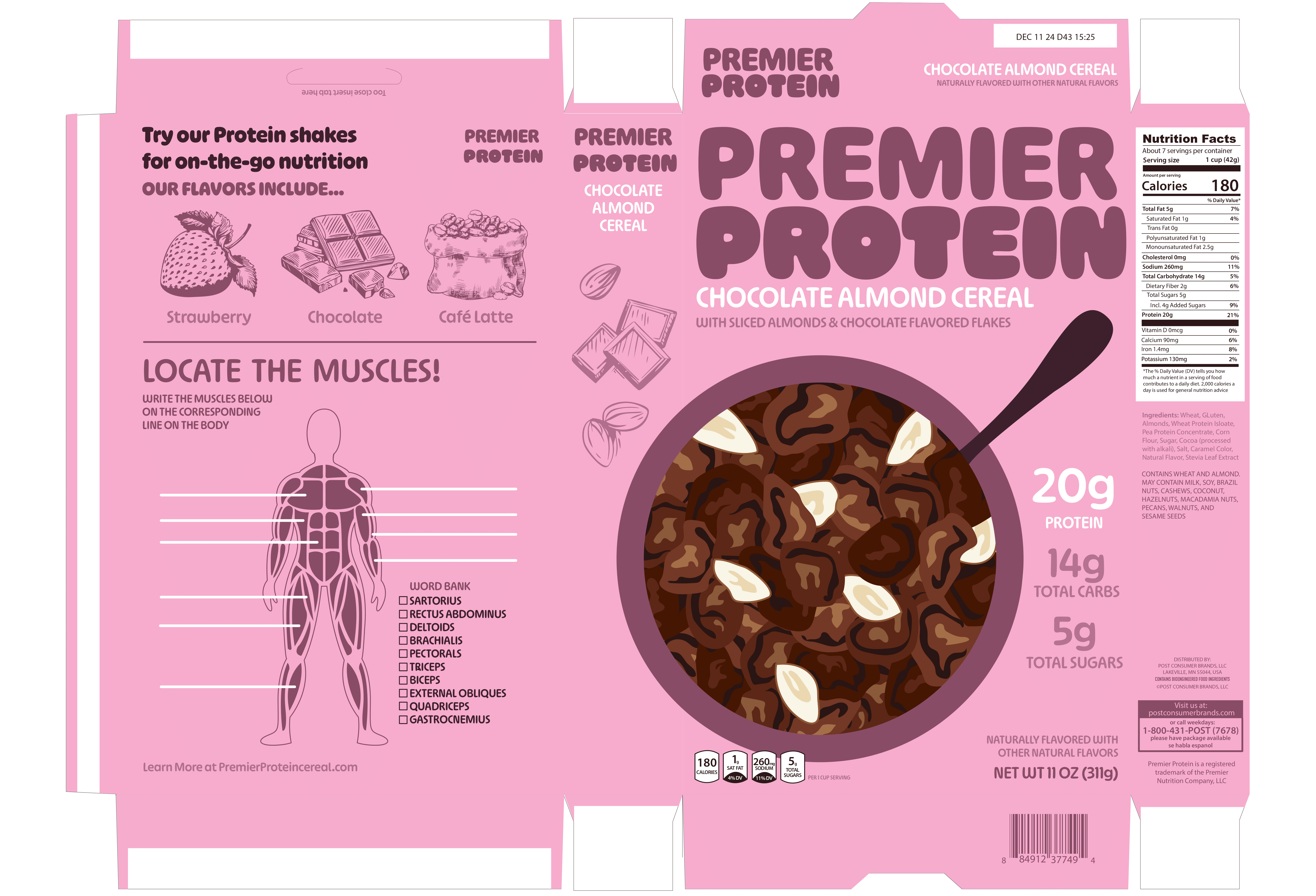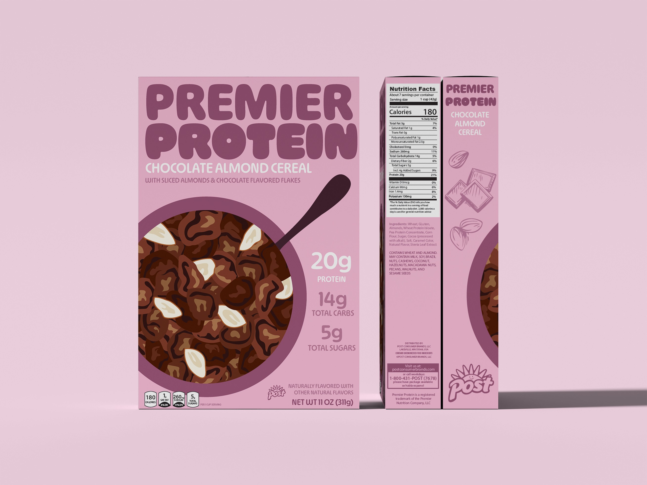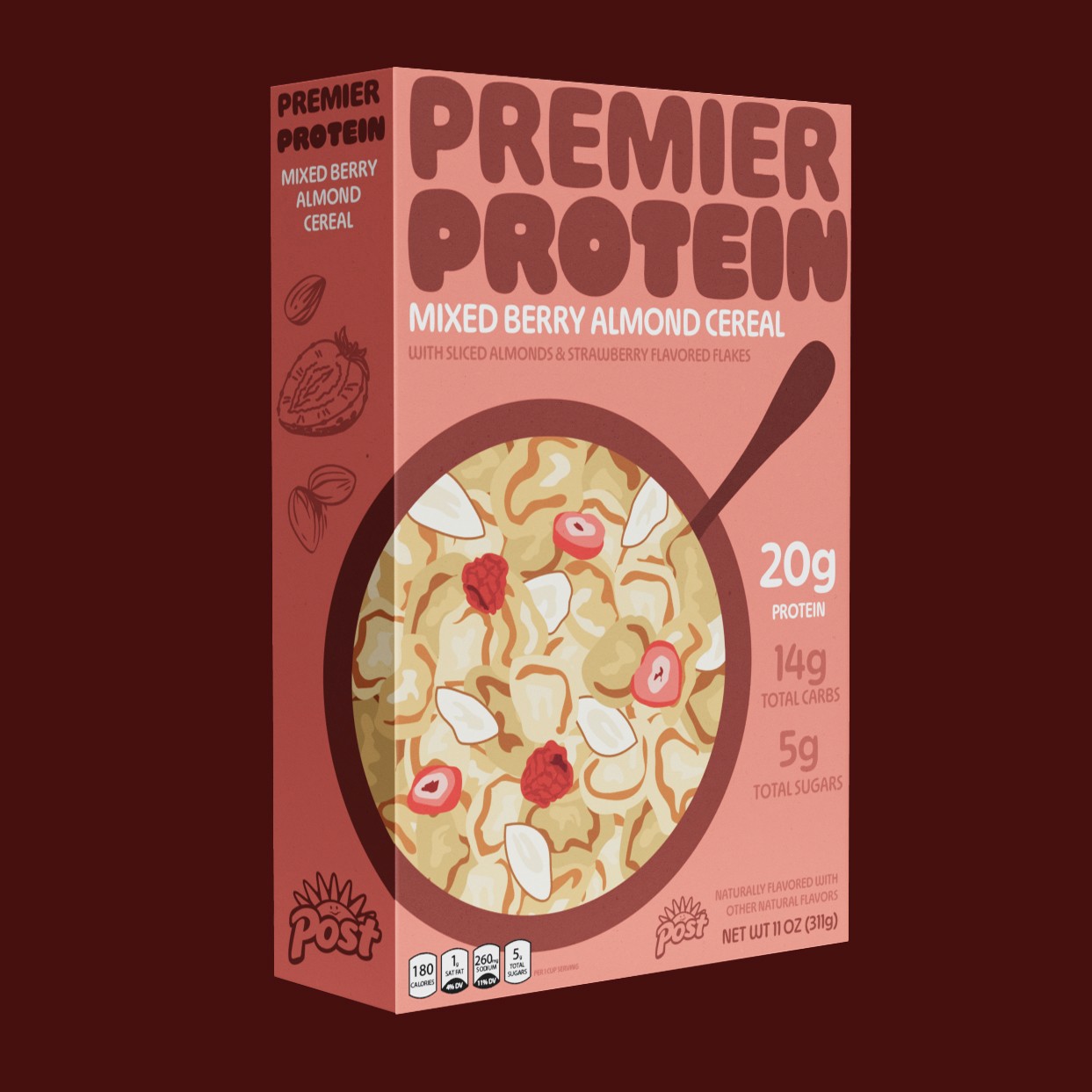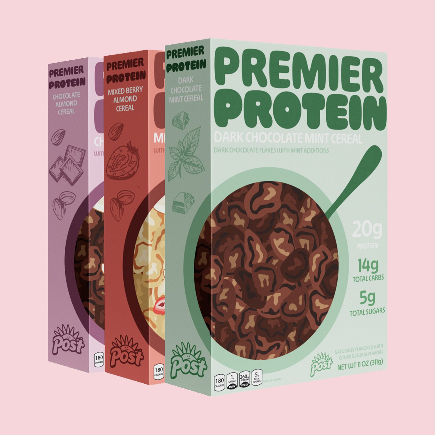 An all new and bold packaging refresh for Premier Proteins cereal line. The idea was to compete with other big name brands by using eye catching colors and tasteful illustrations to attract the attention of younger customers.
